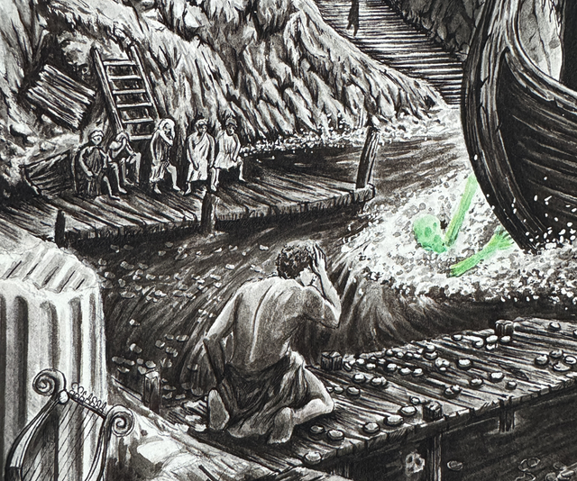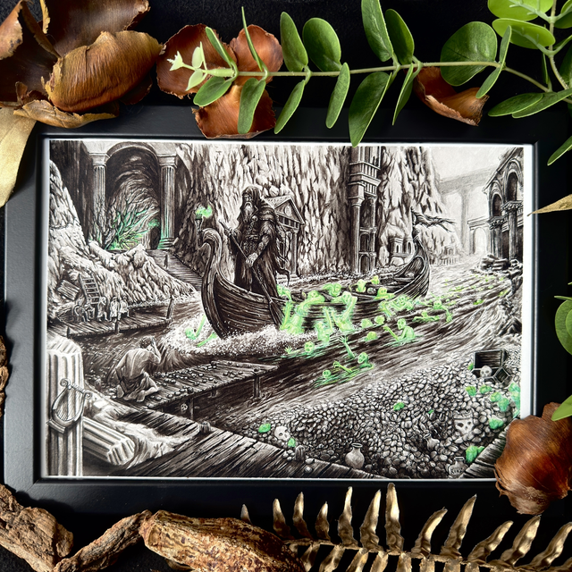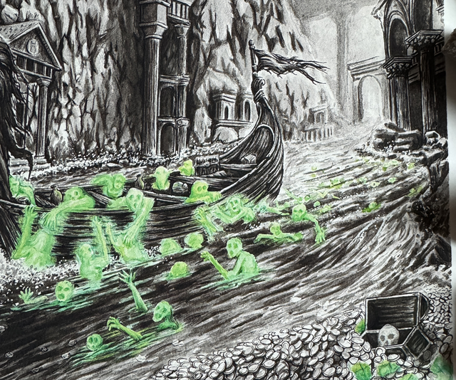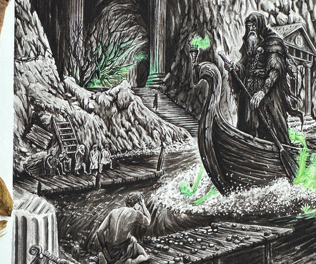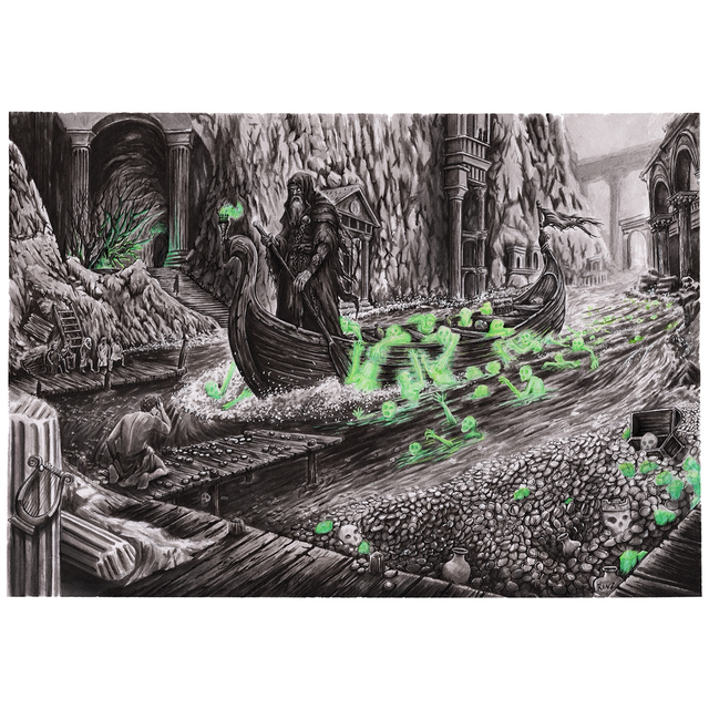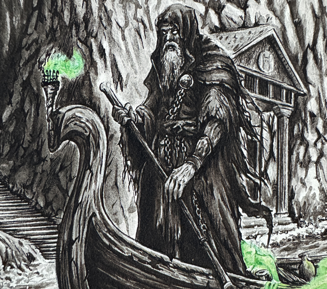 Charon est le passeur des Enfers dans la mythologie grecque. Silencieux et austère, il conduit les âmes des morts à travers le fleuve Styx ou l’Achéron, moyennant une obole déposée dans la bouche du défunt. Vieil homme sombre et spectral, il veille à ce qu’aucun vivant ne franchisse le passage vers le royaume d’Hadès.