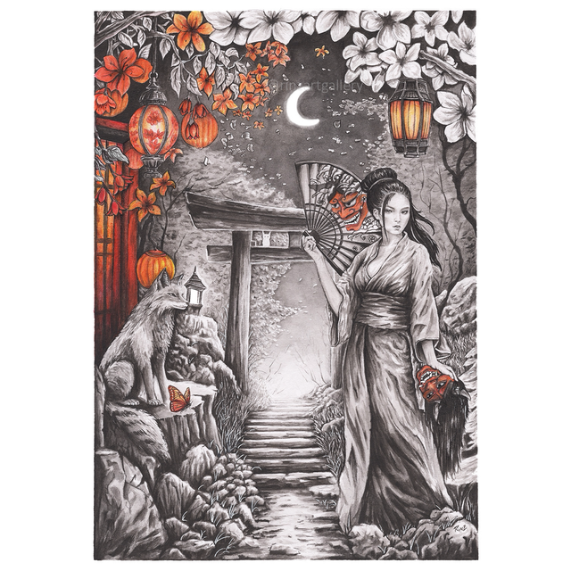 Masque emblématique du théâtre Nô japonais, Hannya est femme consumée par la jalousie et la colère, transformée en démon. Son visage exprime une dualité fascinante : une rage déformée par des cornes acérées, des yeux dorés perçants, et une bouche aux crocs menaçants mais préservant des signes humains. Ce contraste symbolise la souffrance intérieure qui subsiste malgré la métamorphose démoniaque. Utilisé pour incarner des personnages féminins tourmentés, le masque Hannya illustre la complexité des émotions humaines, oscillant entre haine destructrice et chagrin profond.